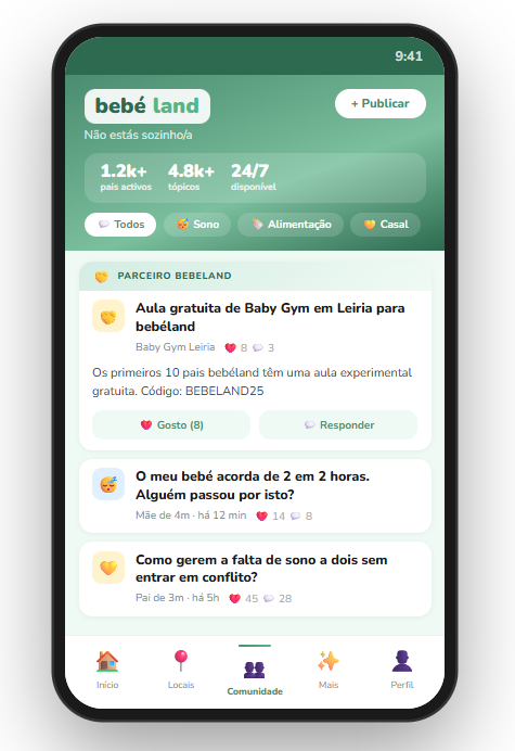 A Comunidade bebéland é o sítio onde percebes que não estás sozinho/a. Sono, alimentação, casal, desenvolvimento - tópicos reais de pais reais, moderados pela nossa equipa. Sem trolls, sem conselhos perigosos. Só pais a ajudarem-se uns aos outros. E os nossos parceiros partilham dicas e ofertas exclusivas bebéland directamente aqui.
