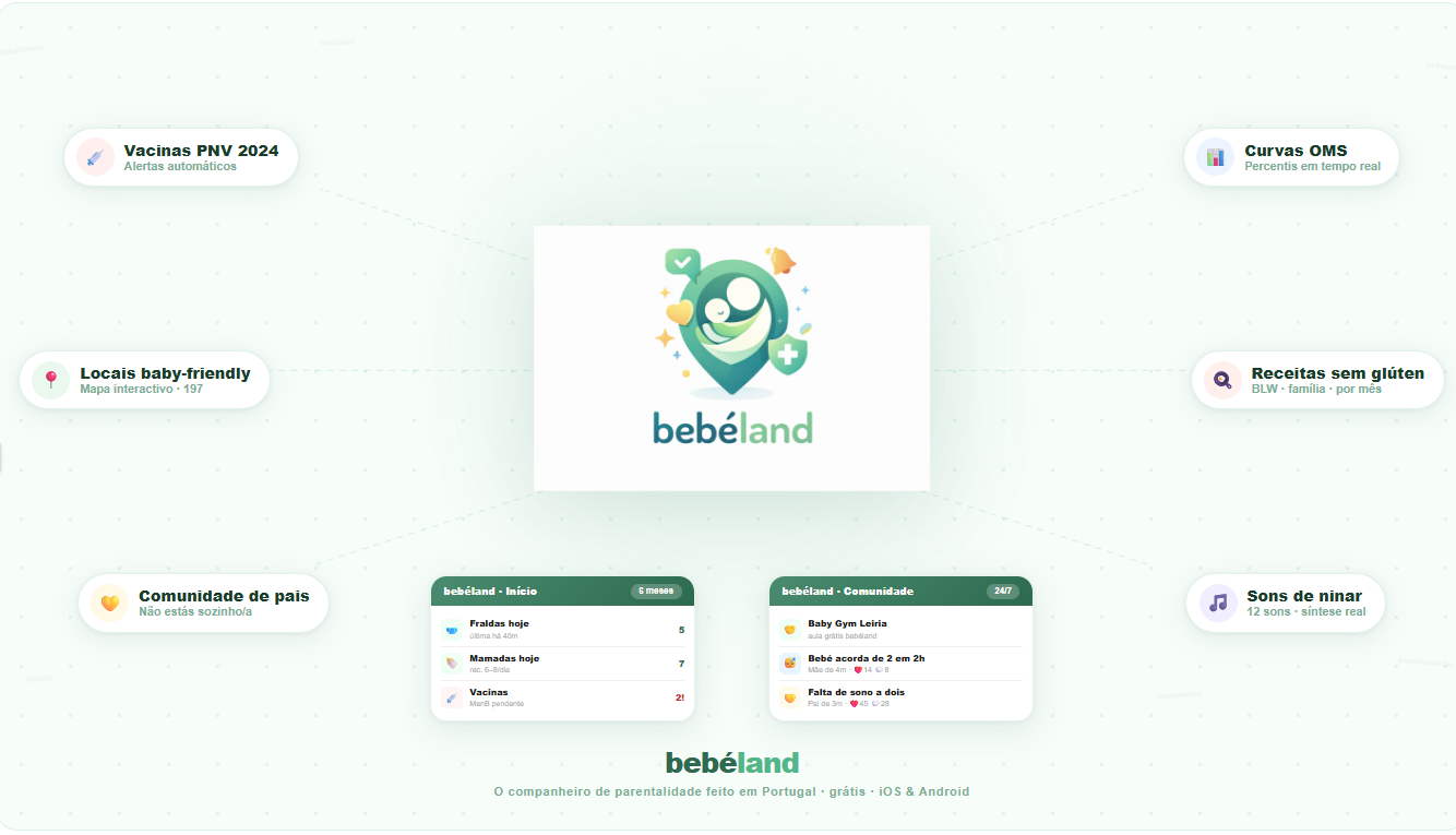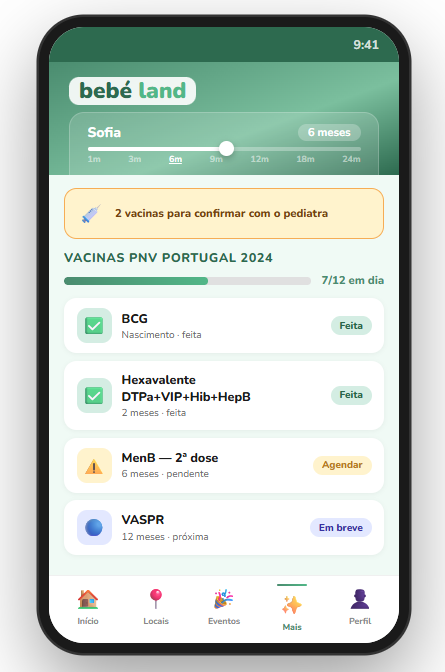 A bebéland tem o Programa Nacional de Vacinação de Portugal integrado - a versão 2024, actualizada, completa. Recebe alertas antes de cada vacina, regista as que já foram feitas e chega à consulta com tudo em ordem. Nenhuma outra app de bebé faz isto em português, com o PNV real.